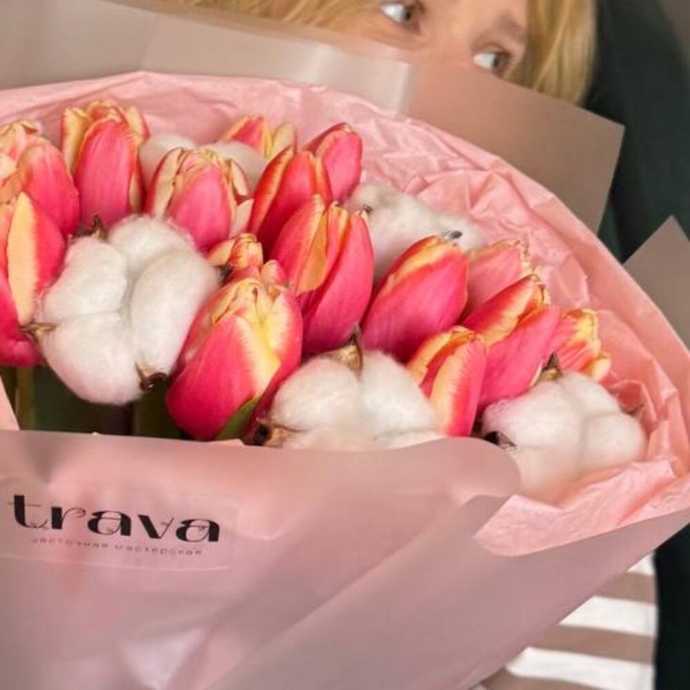 Букет девушке 15 тюльпанов на 8 марта с хлопком в Звенигороде